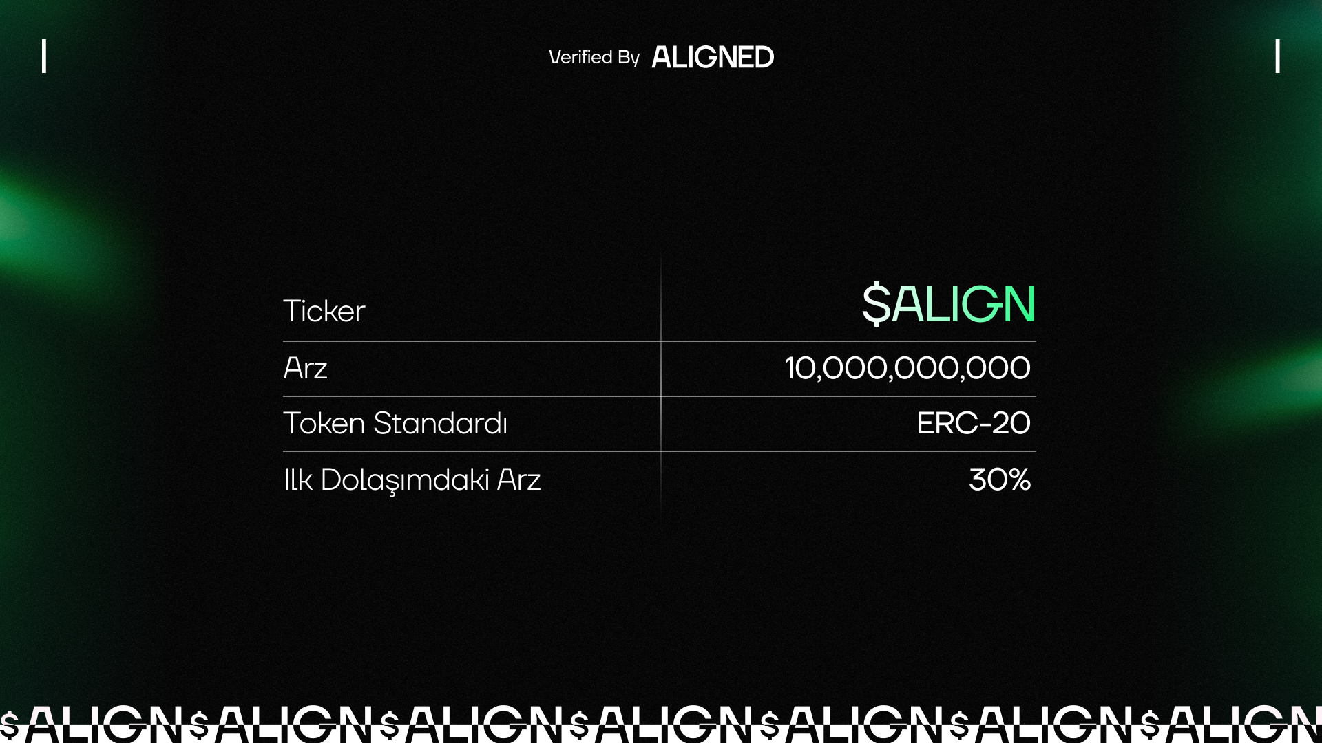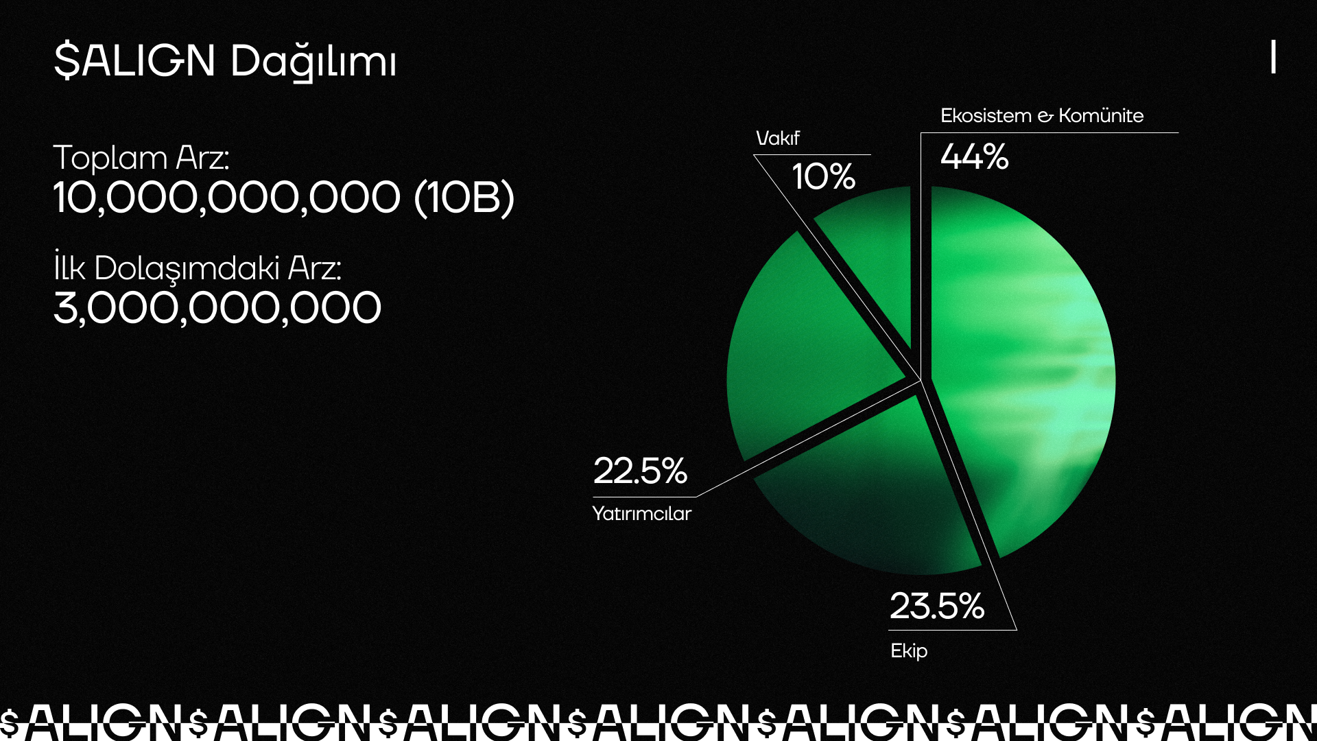 $ALIGN, toplamda 10.000.000.000 (10 milyar) token arzına sahip olacak ve ilk dolaşımdaki arz 3.000.000.000 olacak. Çoğunluğu topluluğa tahsis edilerek, erken dönem çalışmaları ve katkıları tanımak, Aligned üzerinde uygulama ve ürünlerin geliştirilmesini teşvik etmek ve yol haritasını tamamlamak ile uzun vadeli vizyonu desteklemek için kullanılacak.