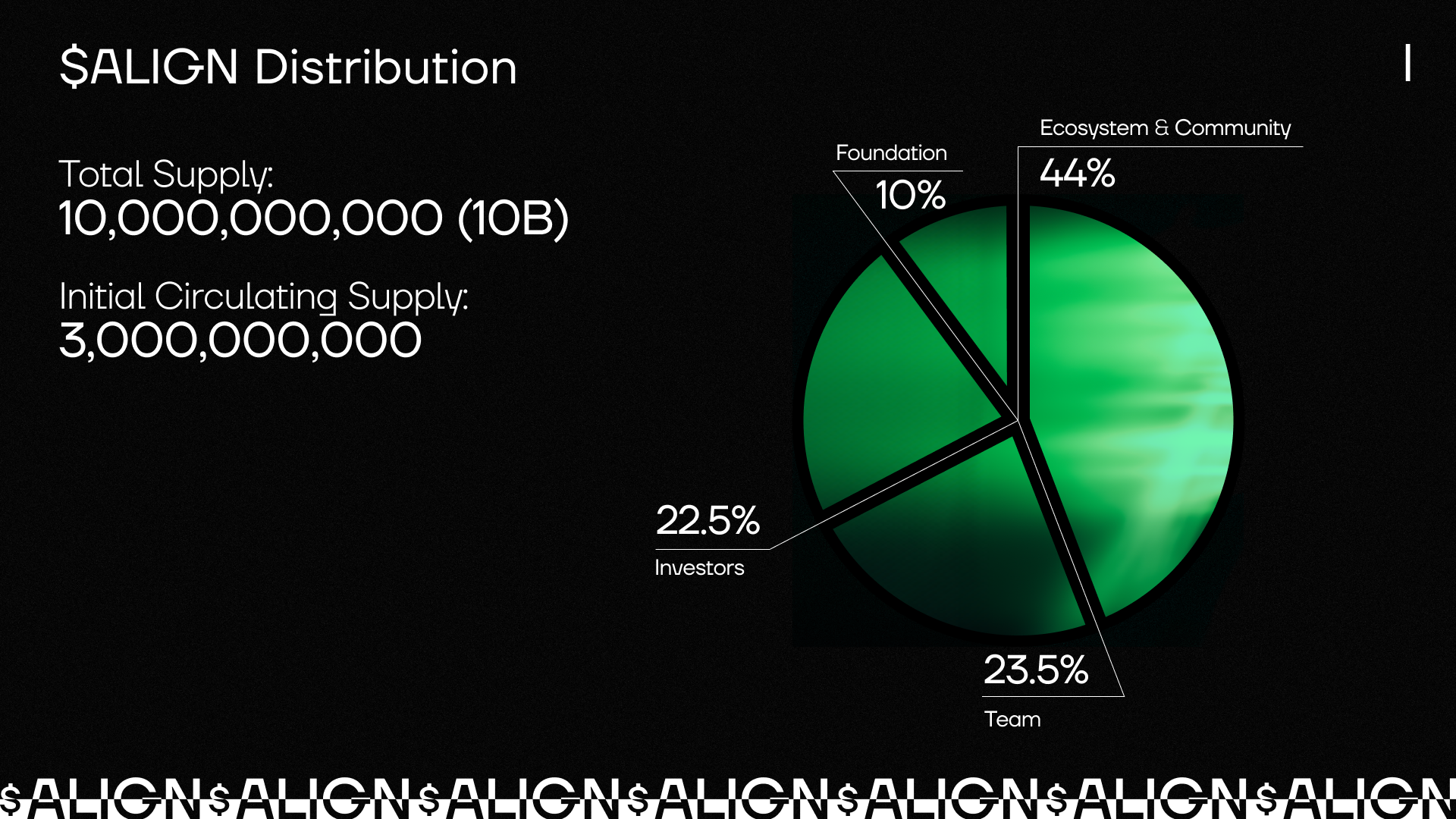 $ALIGN will have a total supply of 10,000,000,000 (10 billion) tokens, with an initial circulating supply of 3,000,000,000. The majority will be awarded to the community, aimed at recognizing early work and contributions and fostering the development of applications and products on top of Aligned, as well as to help fulfill the roadmap and long-term vision of Aligned.