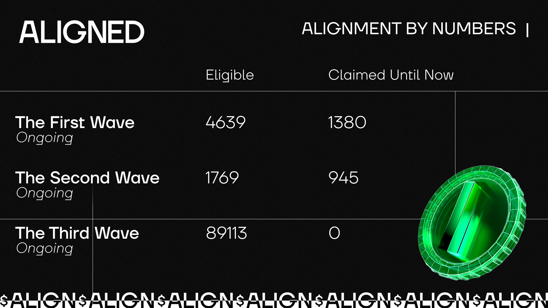 The Aligned Foundation released the tokenomics of \$ALIGN, with a total supply of 10,000,000,000 $ALIGN and an initial circulating supply of 30%. This roadmap prioritizes the community which made all this possible and the first waves to check eligibility for Alignment are live!